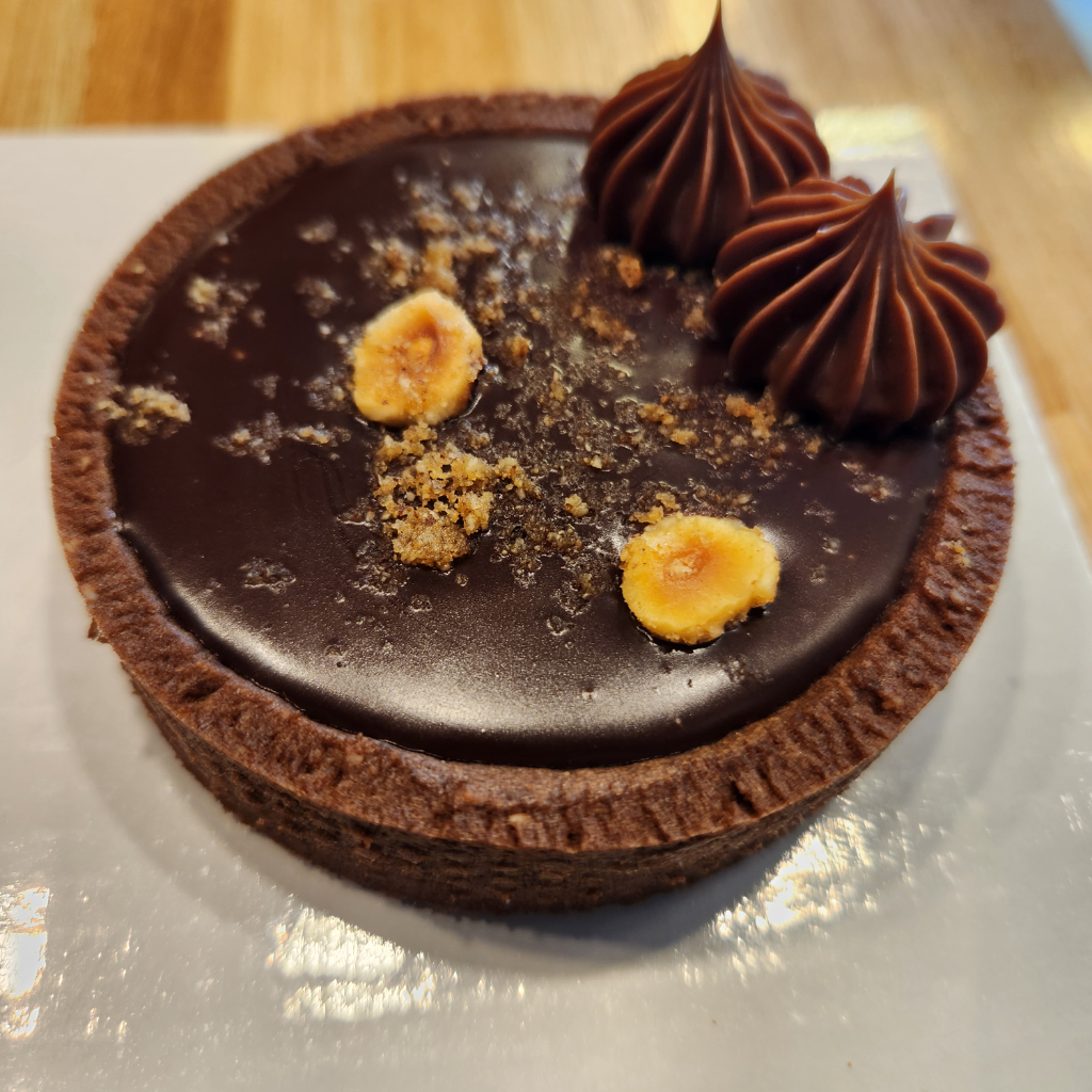 Masa de cacao y almendras + dulce de leche + ganache de choco semiamargo